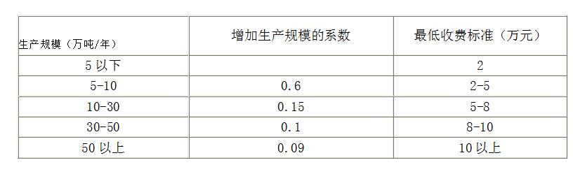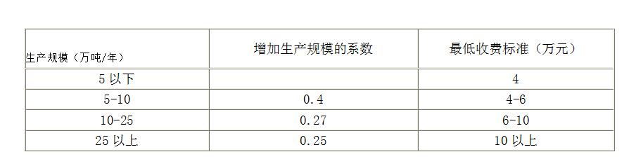 4.生產(chǎn)規(guī)模在區(qū)間內(nèi)的項目評價費=收費標準+(項目的生產(chǎn)規(guī)模-表中相應的生產(chǎn)規(guī)模下限)×增加生產(chǎn)規(guī)模的系數(shù)。